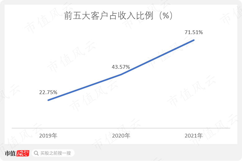 2019年前五大客户只占收入的22.75%,疫情爆发的2020年,五大客户的集中度迅速提高至43.57%。到了2021年,比例已经超过70%,客户集中度风险越来越高。