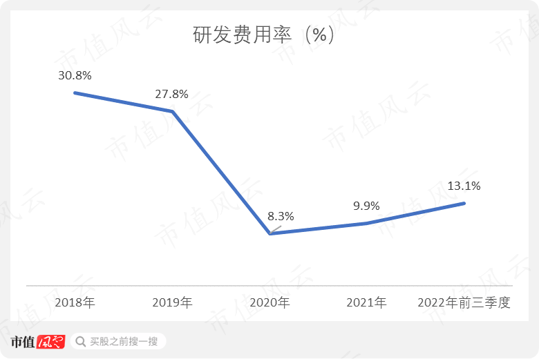 公司的研发费用率在2018、2019年一度达到30%左右。不过后来在2020年暴跌至8.3%,然后又从2020年的8.3%持续提升至2022年前三季度的13.1%。