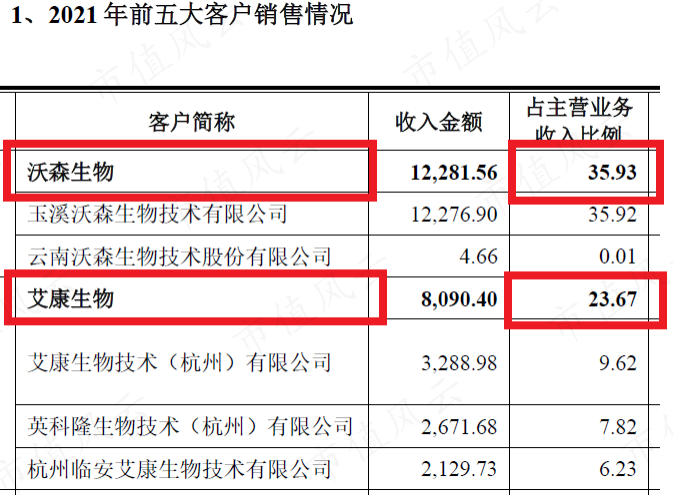 以2021年为例,近岸蛋白的第一、第二大客户分别是沃森生物和艾康生物。沃森生物贡献35.93%的营业收入,艾康生物贡献23.67%,两者合计占营业收入的59.6%。