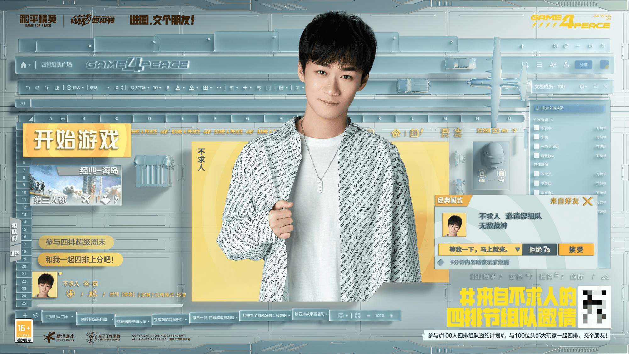 和平精英2022年四排节的“100人四排组队邀约计划”在第二届和平精英国际主播公开赛(PSI)总决赛现场上发布,集结100位明星玩家向全体特种兵发出组队邀请!