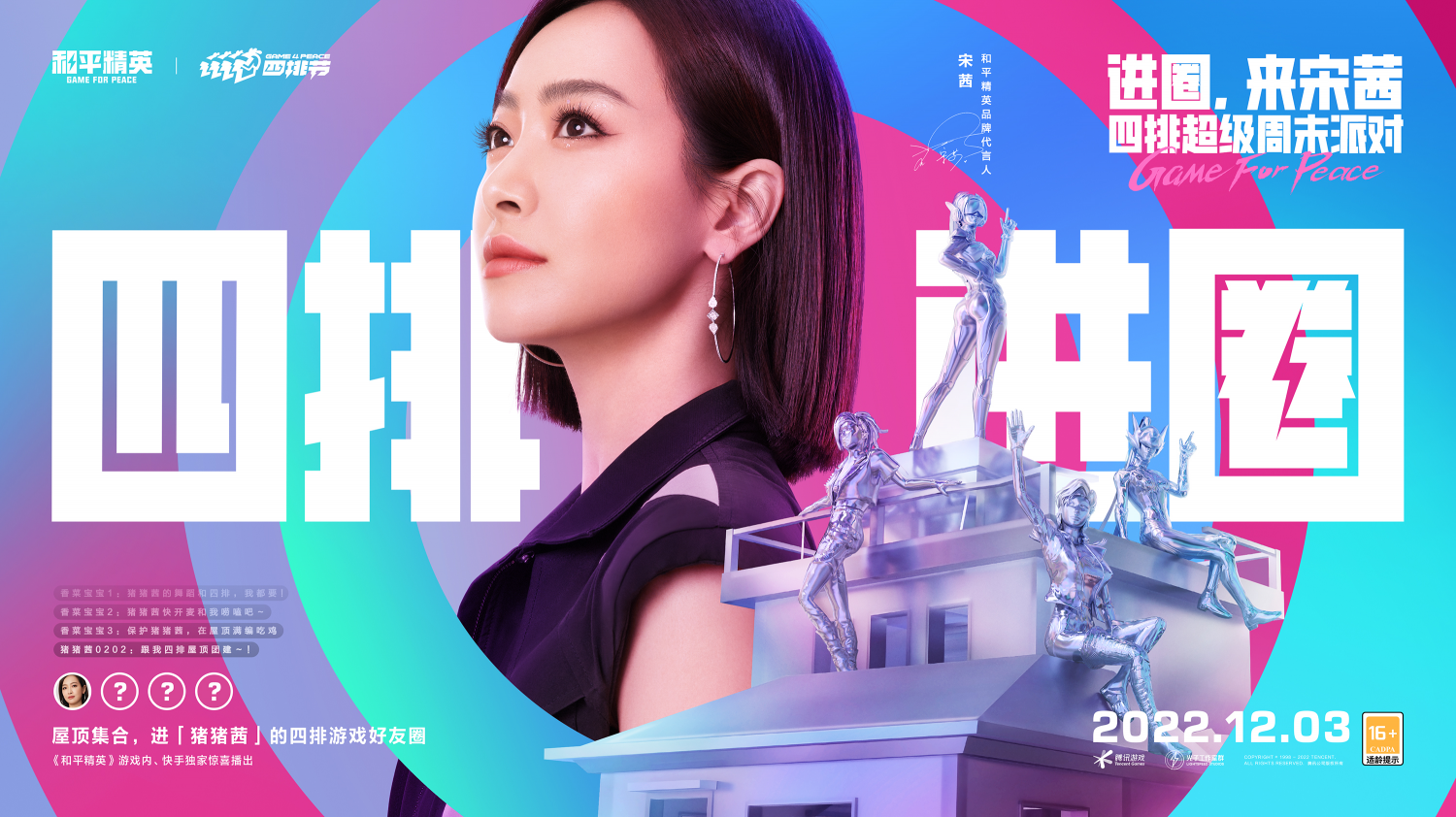 而这部微电影,恰好展示了此次“100人四排组队邀约计划”的玩法核心。此次四排节计划集结了华晨宇、宋茜、希林娜依高等明星玩家,一条小团团、不求人、诚C等人气主播和电竞选手,组成100人的头部大玩家阵营跟自己的粉丝或者水友四排组队。
