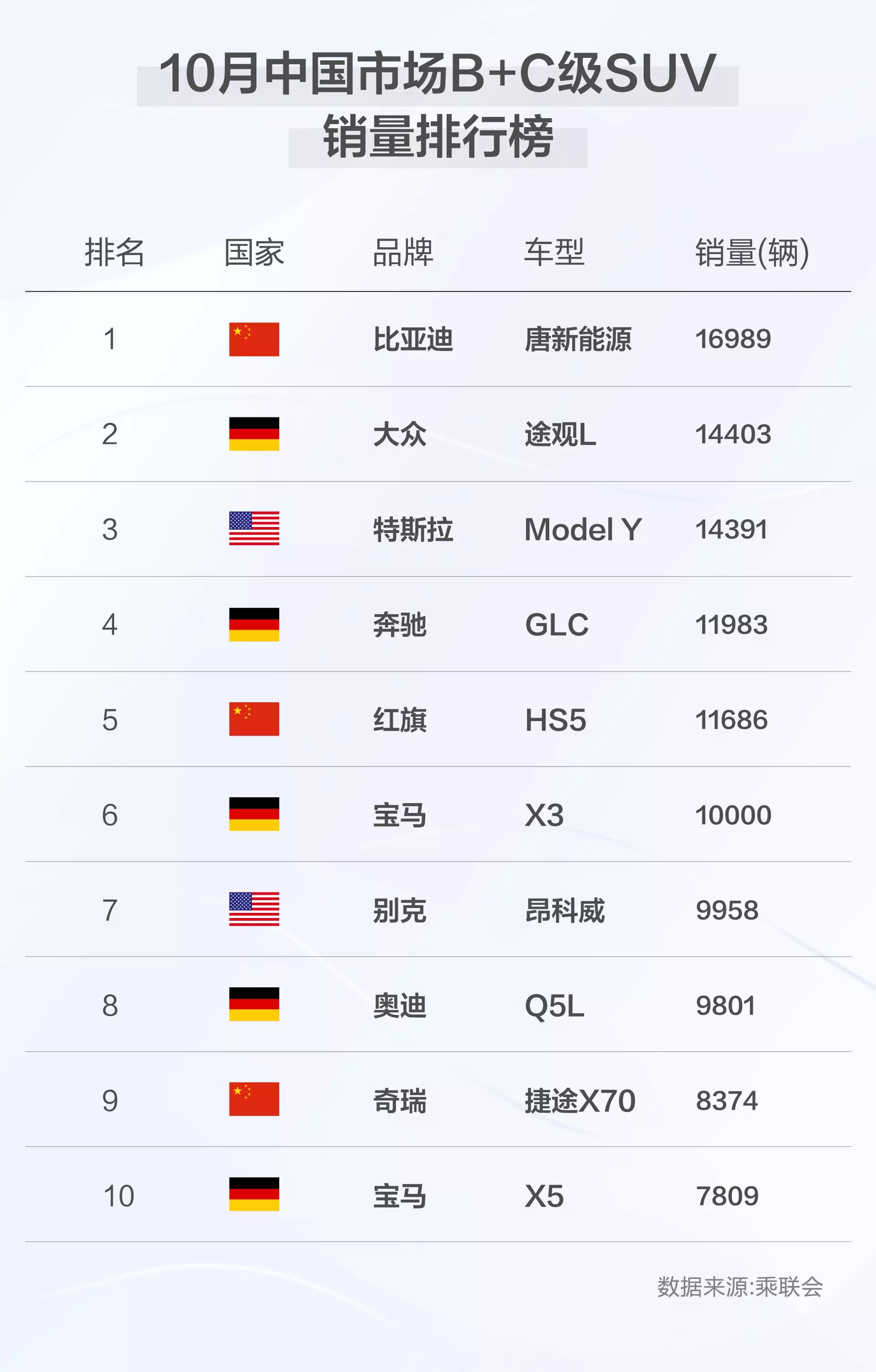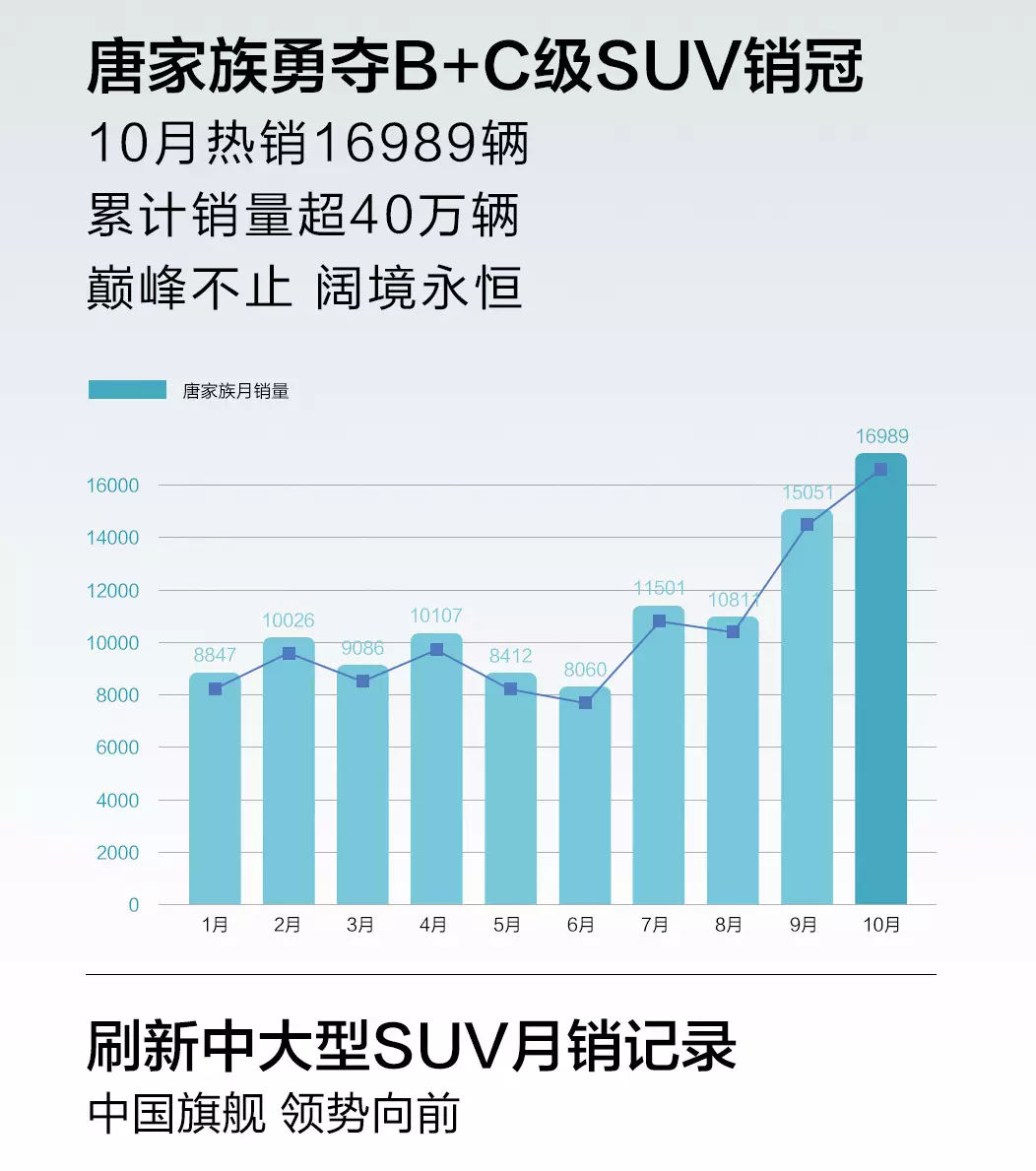 最近几年中国汽车品牌的全面崛起之势已是不争的事实,细分市场方面中国汽车品牌也是拿下了不少A级市场的销冠,不过在B级和C级 高端SUV方面此前一直都是美日德系合资车型的天下。如今这个局面已经被打破,时间来到刚刚过去的10月,比亚迪唐家族销量达到了惊人的16989辆,成功摘下B级+C级SUV市场销量桂冠,成功打破美日德系合资车型长久以来占据的市场领先地位。这是一个里程碑意义的成绩,成功创造了此前中国汽车品牌在B级+C级SUV市场零销冠的突破。