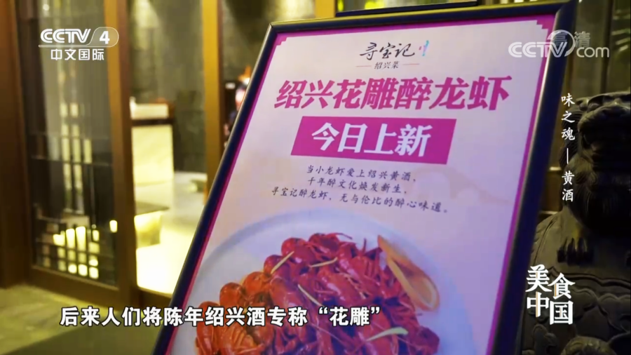 11月9日,CCTV-4央视中文国际频道《美食中国》栏目播出专题片:《味之魂—黄酒》,寻宝记绍兴菜的花雕醉龙虾作为绍兴醉菜的代表,被再次翻牌,与义乌的红曲闻香鸡、梅州的娘酒羊肉一起,展示了绍兴黄酒在美食烹调中的点睛作用。