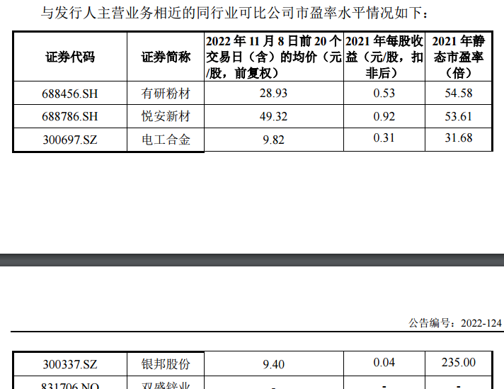 公司所属行业为:金属制品业(行业代码:C33),行业最近一个月平 均静态市盈率为 24.56 倍。同行业可比公司2021年静态市盈率均值为46.62倍。