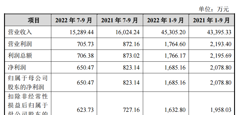 2022年1月1日-2022年9月30日,公司实现营业收入4.53亿元,同比增长4.4%,净利润1685.16万元,同比下降18.94%。扣非净利润1632.8万元,同比下降17.21%。