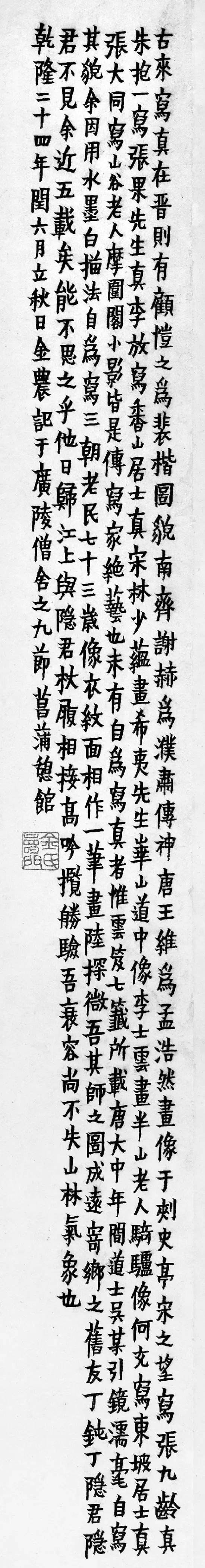 金农在《自画像轴》(故宫博物院藏)(图一六)上长题:“古来写真,在晋则有顾恺之为裴楷图貌,南齐谢赫为濮肃传神,唐王维为孟浩然画像于刺史亭,宋之望写张九龄真,朱抱一写张果先生真,李放写香山居士真,宋林少藴画希夷先生华山道中像,李士云画半山老人骑驴像,何充写东坡居士真,张大同写山谷老人摩围阁小影,皆是传写家绝艺也,未有自为写真者。惟《云笈七籖》所载唐大中年间,道士吴某引镜濡毫,自写其貌。余因用水墨白描法,自为写三朝老民七十三岁像,衣纹、面相作一笔画。陆探微吾其师之。图成,远寄乡之旧友丁钝丁隐君。隐君不见余近五载矣,能不思之乎?他日归江上,与隐君杖履相接,高吟揽胜,验吾衰容尚不失山林气象也。乾隆二十四年闰六月立秋日,金农记于广陵僧舍之九节菖蒲憩馆。”钤“金氏寿门”朱文印。乾隆二十四年(一七五九年),这一年金农七十三岁。