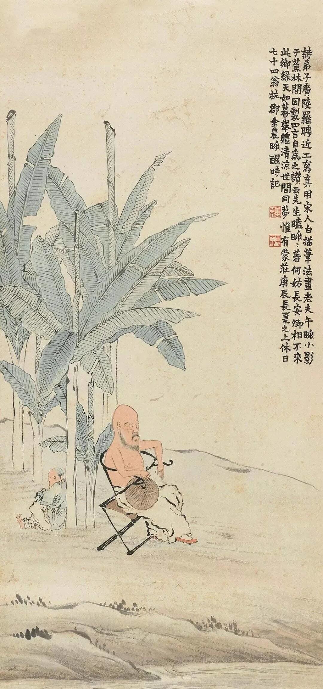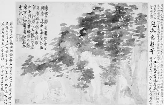 金农《山水人物册》第十一开(图一五)自题:“宋龚开善画鬼,余亦戏笔为之,落叶如雨,乃有此山魈林魅耶。悠悠行路之人慎莫逢之,不特受其所惑也,观者可以知警矣。龙梭仙客记。”钤“金农”“莲身居士”印。潘延龄将其定为“《鬼趣图》粉本”,边跋两段:“罗两峰山人《鬼趣图》题咏如林,名重天下。余秘弆有年,惜已通灵飞去,今复得此帧,其笔墨之妙更为神化欲絶,可以知两峰师承所自矣,欣幸奚似。健庵记于石妙楼。”“罗两峰山人《鬼趣图》其精采夺目令人不可思已!今得之叶南雪太丈,余从得借观,鉴赏不已,归之并将题咏书出,欲剞劂成帙,俾画图之所由来矣。今不能保守此图,日观此诗,未尝不略解余怀,刻守此帧,其精妙入神两峰者可知之焉,己亥润生记。鬼趣图粉本。丁丑孟夏廿二日健庵题。”又题:“此册擕入都门,有人酬以三百金未忍割爱也。”据两段题跋可知,金农或曾亲见宋龚开《鬼趣图》而“戏笔为之”,画此“鬼趣图粉本”;其弟子罗聘(两峰)发扬光大,亦作《鬼趣图》而闻名。所以,此开册页不单单是金农的摹古之作,也证明了其与罗聘之间的师徒传承,其史料价值不亚于艺术价值。金农《山水人物册》在上海博物馆、无锡博物院、渖阳故宫博物院等处亦有收藏,开数、内容有别。