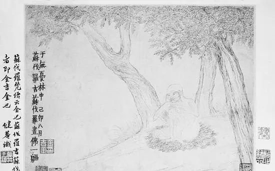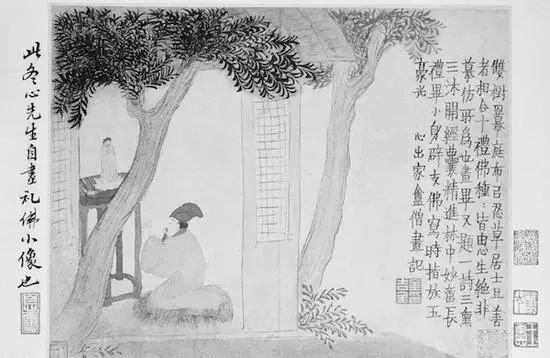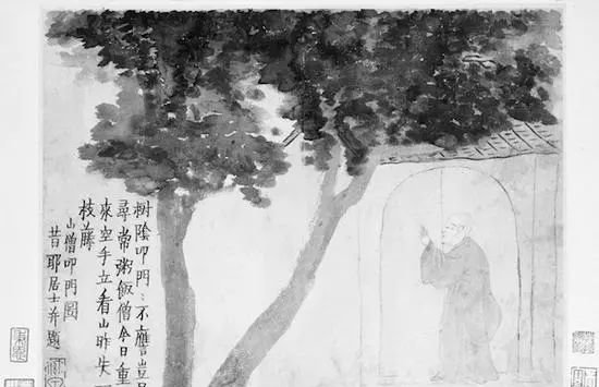金农《山水人物册》第六开(图三)自题:“树阴叩门门不譍,岂是寻常粥饭僧。今日重来空手立,看山昨失一枝藤。山僧叩门图。昔耶居士并题。”