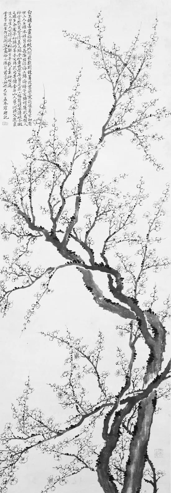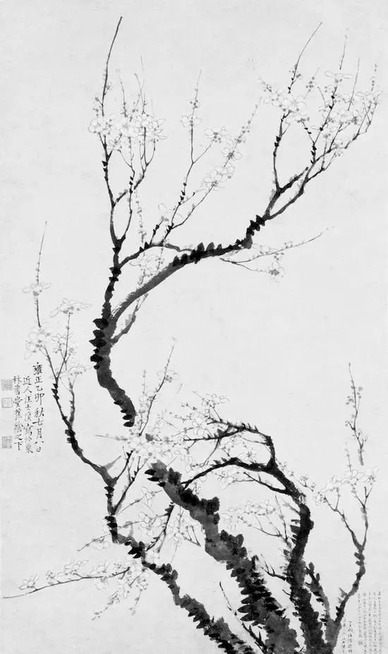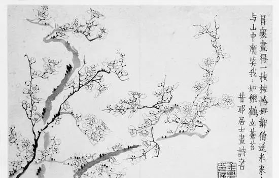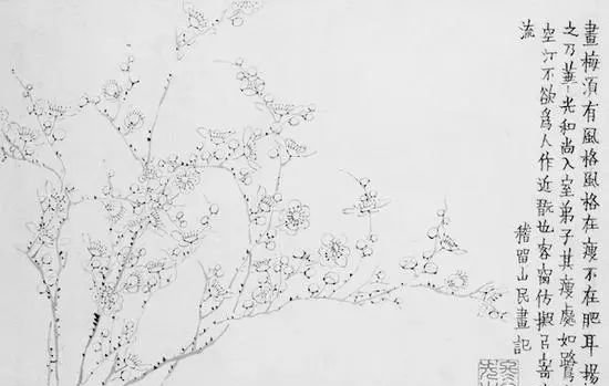 “吾乡龚御史田居先生家有辛贡粉梅长卷,丁处士钝丁家有王冕?红梅小立轴,皆元时高流妙笔,予用其二老之法画于一幅中,白白朱朱,但觉春光满眉睫间,老子于此兴复不浅也。”
