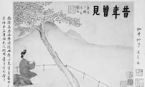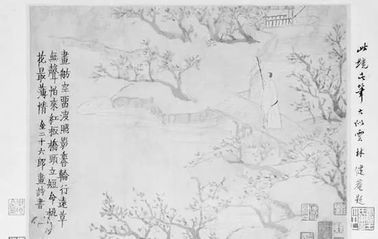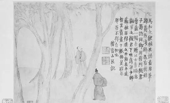 金农《山水人物册》第二开(图一〇)自题:“《马和之秋林共话图》,用笔疏简,作浅绦色,有杨妹子题诗,同乡周穆门徵君曾藏一幅,余赠以古青磁出轴装之。徵君下世,为梁少师芗林所得,进之内府矣。今追想其意画于纸册,是耶非耶,吾不得自知也。稽留山民记。”马和之,南宋画家,高宗时画院待诏,擅画佛像、界画、山水,人物师法吴道子、李公麟,创柳叶描(一作蚂蝗描),有“小吴生”之称。杨妹子,宋宁宗杨皇后之妹,或为杨皇后本人,书法似宁宗,清姜绍书《韵石斋笔谈》评其书“波撇秀颖,妍媚之态,映带漂湘”。