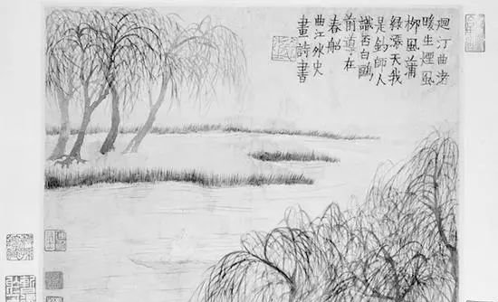 金农《山水人物册》第八开(图一三)自题:“迴汀曲渚暖生烟,风柳风蒲緑涨天。我是钓师人识否,白鸥前导在春船。曲江外史画诗书。”钤“冬心先生”。此画为典型的小景画,一河两岸,垂柳依依。笔墨简淡、清丽儒雅。画中虽不见人物、白鸥与春船,但足可以意会,可看出北宋著名小景画家赵令穰对他的深刻影响。
