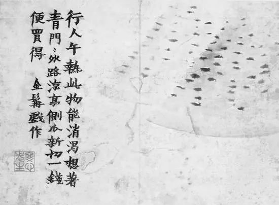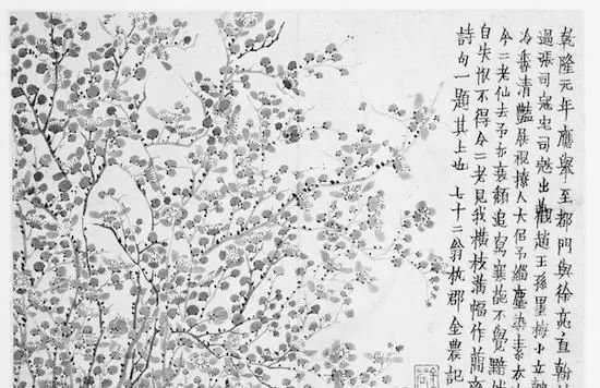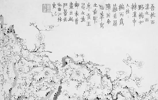 “宋释氏泽禅师善画梅,尝云:用心四十年纔能作花圈稍圆耳。元(笔者按:此处有圈,应为宋)赵子固亦云:浓墨点椒大是难事,可见古人不苟。败梅秃管岂有轻易落于纸上耶。予画梅率意为之,每画一圈一点处深领此语之妙,以示吾门两弟子也。”此跋系金农将对古人画梅理论的理解付诸实践,并将其方法传授弟子。