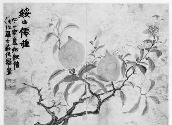 金农《花卉图册》第八开(图二)画斜枝上两只仙桃并列,桃花数朵盛开,自题:“绥山仙种。心山家盦粥饭僧,苏伐罗吉苏伐罗画。”