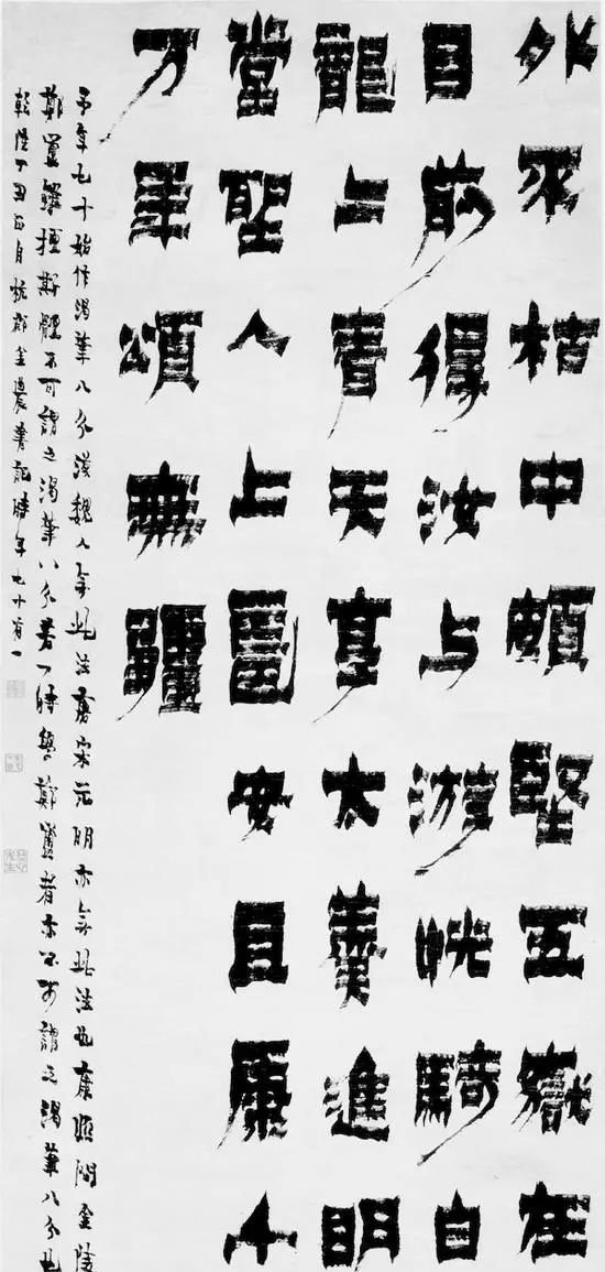 实际上元吾丘衍《学古篇》释科斗文云:“上古无笔墨,以竹梃点漆书竹上,竹硬漆腻,画不能行,故头粗尾细,似其形而”;宋代米芾曾言“臣书刷字”,“竹简以竹聿行漆”;所以,漆书无论是从书写工具,还是从行笔方法来说早已有之。金农在结合了隶书、楷书的基础上,将漆书发扬光大,创作出笔法丰富、笔力雄强、墨实浑厚、古朴逸宕的漆书,成为金农书法中最具特色的、标志性的书体。“截毫端作擘窠大字” ,即剪去毛笔的锋毫,以笔当刷,以致字体棱角分明;由于笔端吸墨充实,所以又有点画浓重之特点。其用笔方正,结体紧凑、横粗竖细,端正中有欹侧之姿,古朴中藴天真之趣;“以拙为妍,以重为巧”,“苍古奇逸,魄力沉雄” 。金农漆书这种结合了绘画笔墨技巧和金石篆刻之气的异态风格,可以算作是对隶书的一种创新。板桥郑燮称赞金农的诗书:“乱发团成字,深山凿成诗。不须论骨髓,谁能学其皮。”这是对金农书品诗格最高境界恰如其分的评价了。然而这种偏离传统的书体,从书法艺术角度看,当时并不为世人所趋,但映射出当时扬州地区一些士人的生存状况和求变心态。康有为说:“乾隆之世,已厌旧学,冬心、板桥参用隶法,然失则怪,此欲变而不知变者。”然“作字先作人,人奇字自古”,正如金农与郑燮。