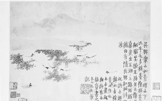 “径山道人岂画梅,写此寄之,并自度新词书其上。三五溪翁谓陈仲父镏,巨生诸隐君也。山僧送米乞我画,墨池游戏极瘦梅花,……”