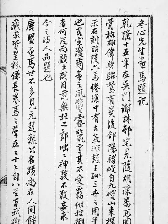 “冬心先生画马题记”目下记录了其鉴赏古画的活动、心得和艺术见解。其间写到“乾隆十五年,在吴门谢林村宅见随胡瓌《番马图》”,“唐贤画马世不多见,元赵魏公名蹟尚在人间,储藏家皆是粉缣长卷,马之群五五十十,自八至百,或柳阴晚浴,或花底滚尘,芳草斜阳中,交嘶相啮之状也”。“写此老骥尚有壮心,比之于人,不无日暮途穷之歎,世间罢羸者睹之,踌踌然同一伤感乎。”“予摹唐人画马,皆画西域大宛国种,用笔雄俊,别开生面。” “秃笔扫骅骝,韦侯画马之妙也。”“世传韩干画马,一日有人诣门,自称冥使,请马为坐骑,公乃画马一匹,焚之后,于寝室见前冥使来谢,云:关山道远,赖公无跋涉之苦矣。甚感召遂若是乎。今予写此,颇亦通灵,安得有求之者入梦而相告也哉。”后接题跋:“此本为仪徵老友吴让之熙载手抄,仅得画梅、画马题记。今传世虽有全刻,余宝此册盖以书重也。光绪十年六月兰味老人记。让之归道山忽忽已十馀年,展卷为之怆然。”