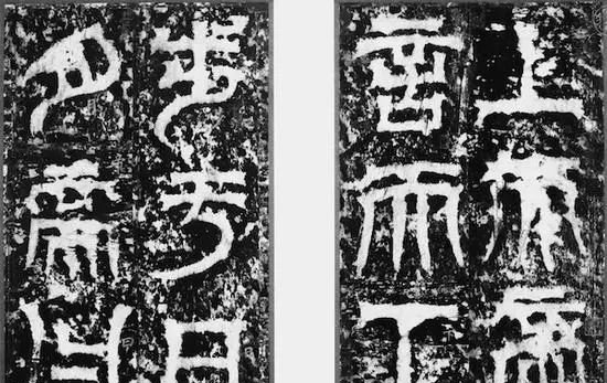 早岁金农曾随其师何焯习“二王”及顔真卿书法,怀有文人的情怀,亦想在官场有所发展。但随着科考的失利,金农将入仕无望的情绪倾泻于书法之上,遂以反传统、不流于世俗为艺术主张。金农的书法以行草书和隶书擅长,晚年他的隶书尤其别具特色,其书法得力于《天发神谶碑》(图八)和龙门造像碑文等,融合了汉隶、魏楷的体式,形成一种独特的隶书书体,后人称之为“漆书”。金农《漆书轴》(故宫博物院藏)(图九)中这样评论自己的书法:“外不枯,中颇坚,五岳在目前。得汝与游,恍骑白龙上青天。享太羹,进明堂,圣人上寿安且康。千万年,颂无疆。予年七十始作渴笔八分,汉魏人无此法,唐、宋、元、明亦无此法也。康熙间金陵郑簠虽擅斯体,不可谓之渴笔八分者,一时学郑簠者,亦不可谓之渴笔八分也。乾隆丁丑正月杭郡金农书记,时年七十有一。”钤印“金吉金印”“冬心先生”。金农虽未称自己的隶书为“漆书”,但他自称为“渴笔八分”,并且自负地认为前无古人后无来者,乃为自己独创的新书体。他也曾用这种书体为郑板桥写下《八分书横额册》(故宫博物院藏)“耕田谷口人家”六个大字,款署:“乾隆己卯九秋,板桥先生自题,嘱杭郡老友金农以八分书之,农今年已七十三岁矣。”钤“金吉金印”“生于丁卯”。题跋:“此金冬心为郑板桥书额真迹,考《汉书》有谷口郑子真,修身自保,扬子法言有谷口郑子真耕于岩石之下,名著京师语。板桥题额意当本此,用以自况。冬心先生为作八分书,古穆遒劲,具汉魏风骨,晚年精到之笔至为可宝。两公在清代同负书画盛名,久为世重,今展读遗墨,缅想当日文字应求之乐,益令人倍增景慕。壬辰岁首得此于宣南,墨缘眼福窃用自憙,原额庋藏不使,因装治成册,俾前贤手迹得以流传久远也。叠倸敬识。”钤“王季馆印”“叠采山民”。题跋中也讲到八字横额是写给板桥的,虽仅有八个字,对于认识金农的书法和与郑燮的交往十分重要。“生于丁卯”一印,印证了金农的生年,丁卯为清康熙二十六年(一六八七年)。金农的弟子们也未言及“漆书”一说。杨岘在《迟鸿轩所见书画录》中记载了金农隶书兼有楷书的体式,用笔扁方,墨浓如漆,故称其书为“漆书”。