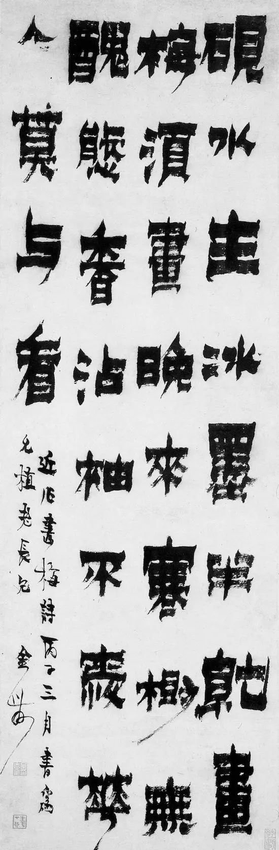 金农《隶书画梅诗轴》(图二〇)写道:“砚水生冰墨半乾,画梅须画晚来寒。树无丑态香沾袖,不爱花人莫与看。近作画梅诗,丙子三月书为允植老长兄,金农。”钤“金吉金印”“生于丁卯”。收藏印“李一氓五十后所得”。丙子为乾隆二十一年(一七五六年),金农七十岁。也就是在这一年,金农收罗聘为弟子,从其学诗作画。