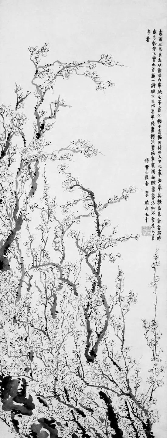 金农《墨梅图轴》(图二二),整幅画面以淡墨润笔勾画繁密梅花朵朵,生机盎然,姿态横生,繁而不乱,空灵清逸,使人感到暗香涌动。右侧自题诗:“香雨三兄良友以前明内库纸乞予画江梅小直幅,因仿元人王元章法,奉其教益,茶熟香温时定多物外之赏也。并题一诗:砚水生冰墨半乾,画梅须画晚来寒。树无丑态香沾袖,不爱花人莫与看。稽留山民金农,时年七十。”钤印“金氏寿民”。