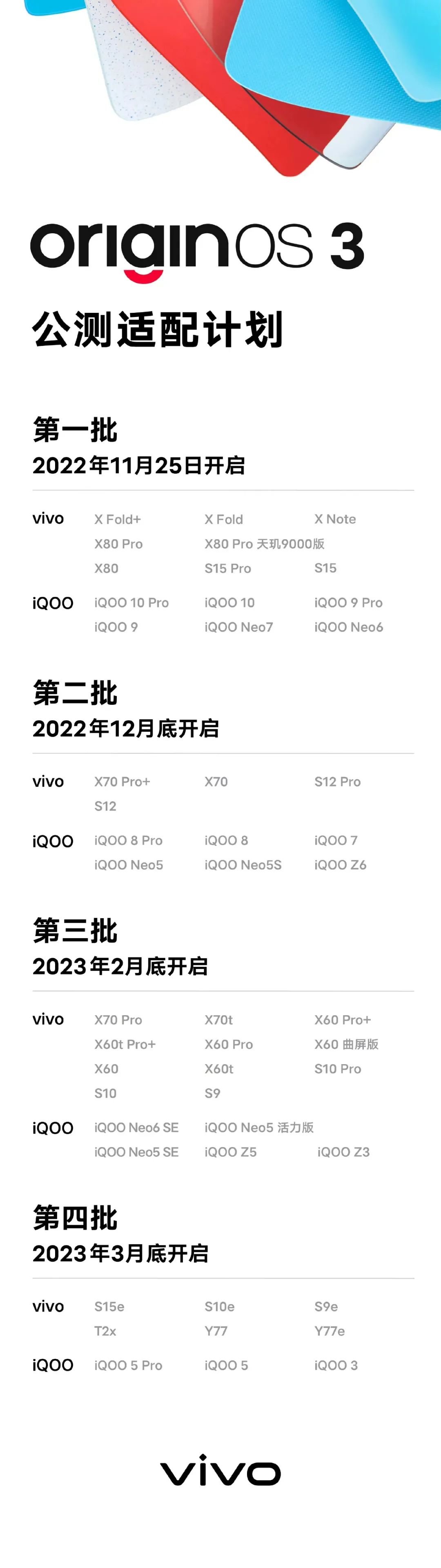 第三批机型将于2023年2月下旬发布,包括X70系列、X60系列、S10系列、S9、iQOO Neo6SE、iQOO Neo5SE、iQOO Neo5活力版、iQOO Z5、iQOO Z3;第四批机型2023年3月开启,包括S15e、S10e、S9e、T2x、Y77、Y77e、iQOO5Pro、iQOO5、iQOO3等。