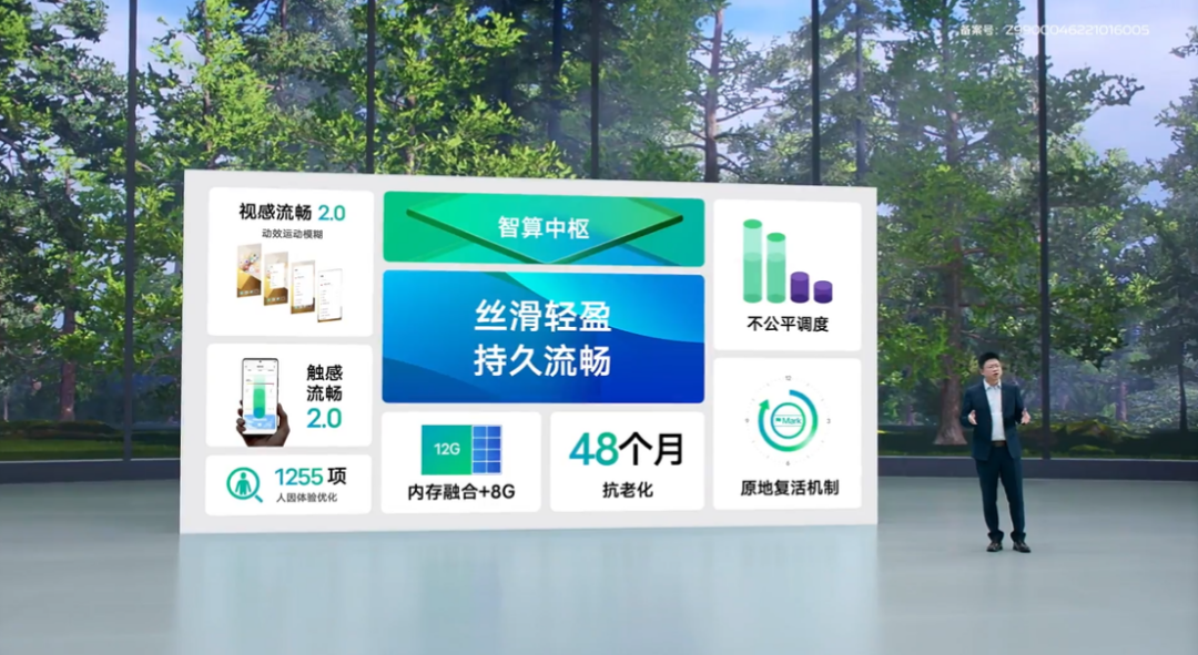 这次系统内的优化会多些,带来了48个月抗老化,运行方面最大做到8G内存,12G内存后台应用保活数量最高可达34个,可在手机上查看存储的碎片化状况、电池健康度、闲时自动优化等。