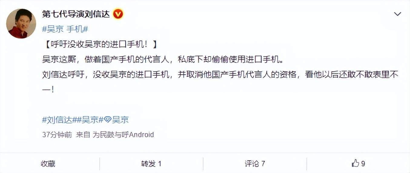 但也有少部分思想比较偏激的人,比如导演刘信达就在微博上呼吁,说要没收吴京的iPhone,取消他的国产手机代言人的资格,从而达到以儆效尤的目的。