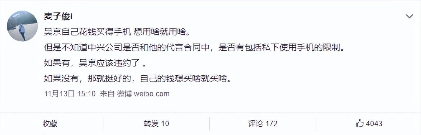 现在最大的争议点在于,吴京和中兴的代言合同里头,是否有对代言人私下使用其它品牌手机的限制。如果有的话,那么吴京违约无疑,恐将面临解约或索赔,但要是没有的话,那就没有多大的问题,顶多也只是道德绑架骂几句也就过了。