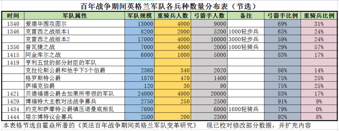 ▲图注:随着百年战争旷日持久,英国长弓兵比例越来越高,重骑兵占比反倒在下降