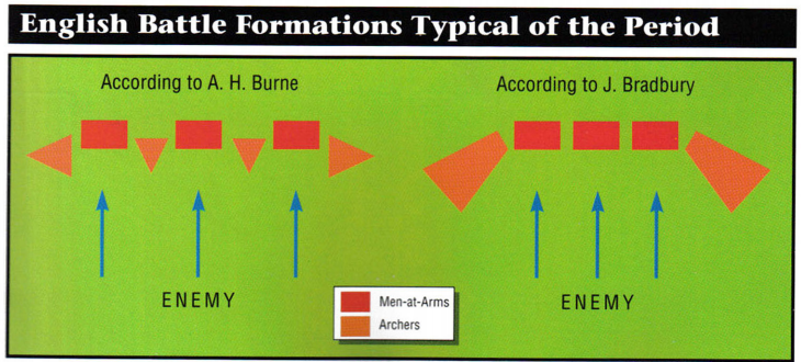 ▲图注:两种英军典型的作战队形示意图,重骑兵(men-at-arms)和长弓兵(archers)都很重要。