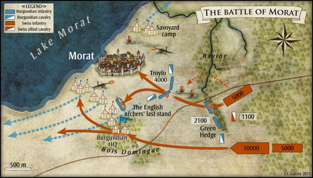 他把弓弩手布置在东北面的小山,炮兵和长弓兵则坐镇东南方的小山,互为犄角以发挥火力。瑞士人的军队规模稍大些,他们制定了歼灭勃艮第军队的计划:约5000人牵制东北方小山的弓弩手,主力10000多人攻击防线正面,紧随其后的5000多名后卫会试图迂回切断后路,另有的1000多名骑兵负责支援。