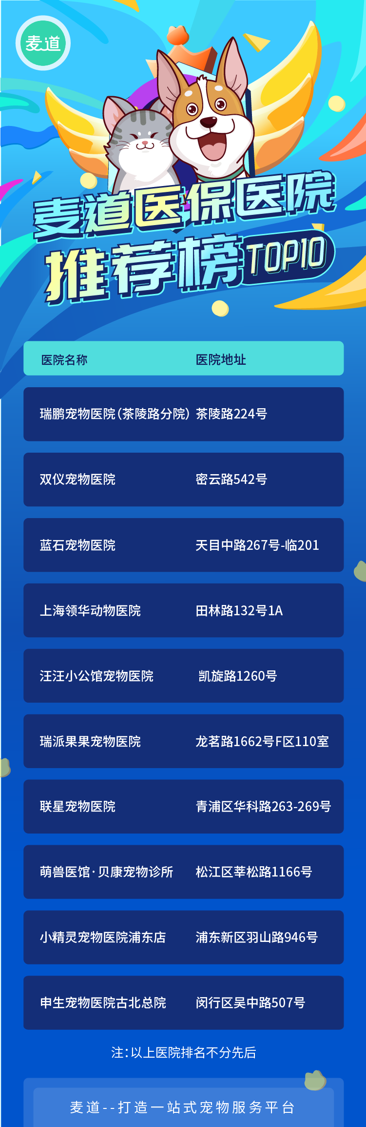 别担心,小麦每月都向麦道宠物医保用户收集医保定点医院的推荐!这不,根据用户们的选择,10月医保定点医院TOP10榜单也新鲜出炉啦: