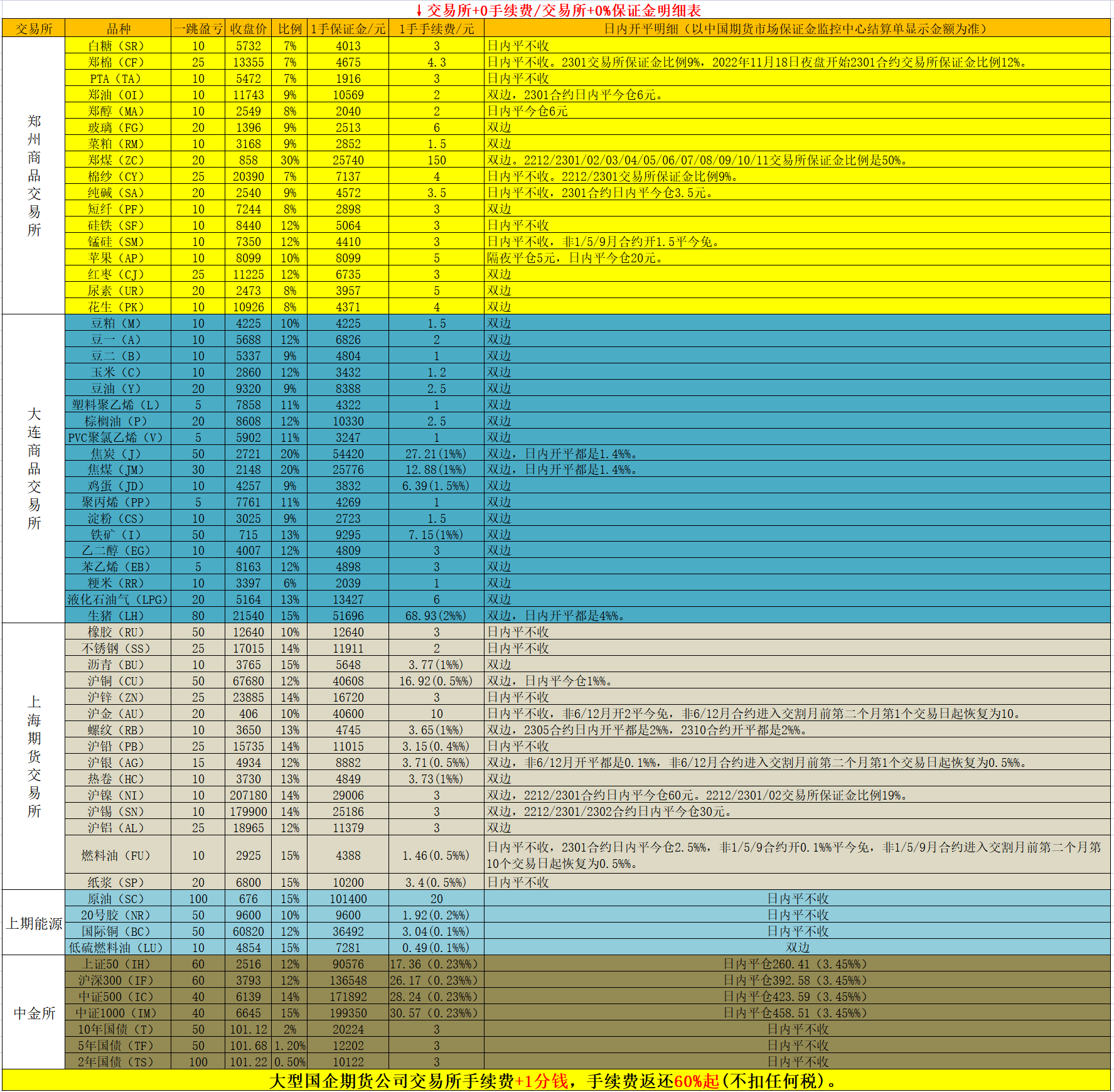 下面是2022年11月最近的交易所手续费和交易所保证金一览表,请您查看。
