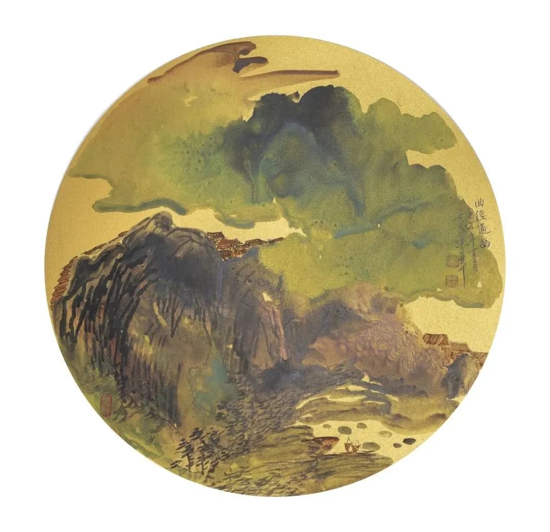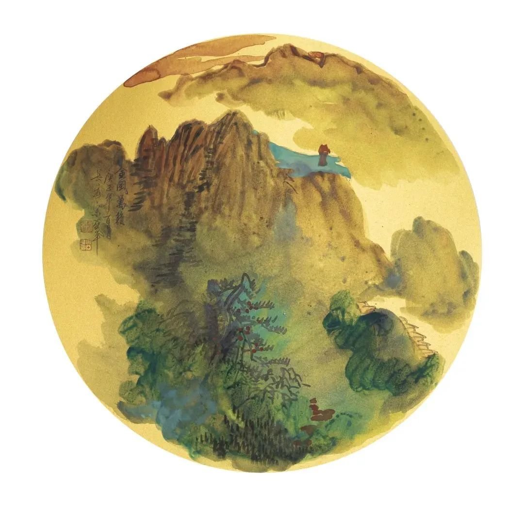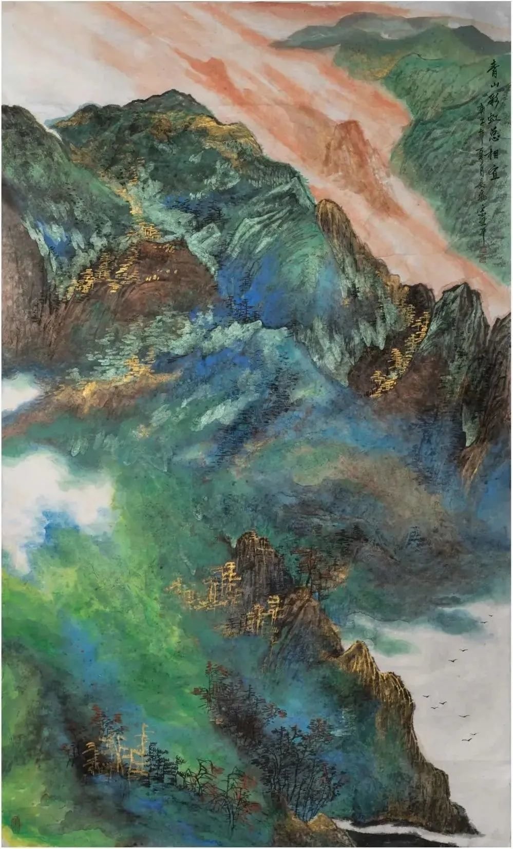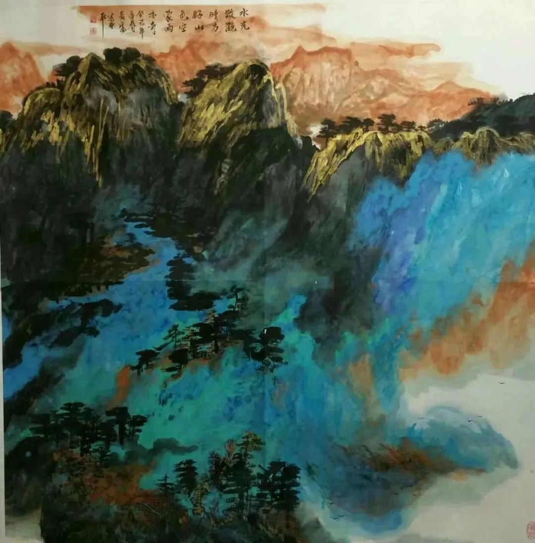 亞平选择青绿山水几乎是必然的。有人说这种选择,是因了唐代李思训开先河的青绿山水体现着“富贵文化”的豪华典丽,而和女画家的身世及追求有某种暗合;或者说,是因了青绿山水以“金碧辉煌”讴歌李唐盛世,而和女画家对现今时代的感受有某种相通。这些解释不能说没有道理,却极可能是皮相之论。亞平对青绿山水的选择,最主要最深湛的原因,我以为不在身外的某处,乃在于她的生命本体之中。是内在生命选择了绘画风格。画家心中的阳光投射于客观世界,而使她眼中她笔下的山水千般阳光,万般明丽。在斑烂的色彩组合和线条流动之中,能够明显地读出艺术家主体的内心状态。她那种带着鲜明女性特征的对自然、对生命、对人生的热爱与眷恋,无时不刻在心中转化为浓烈的感情吟叹,有时是色彩如音乐般地流动起伏,有时又是音乐如色彩般地组合凝定。
