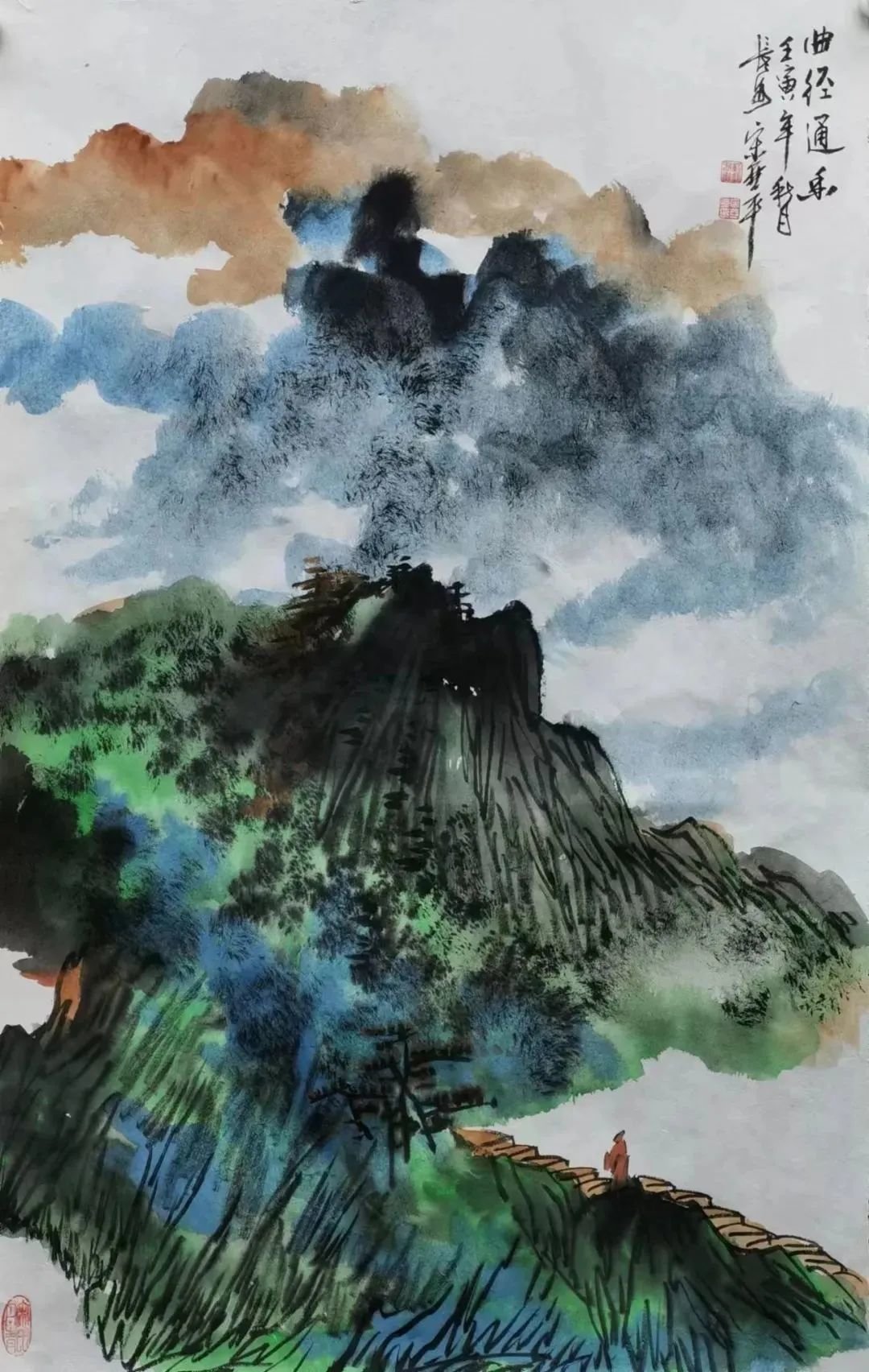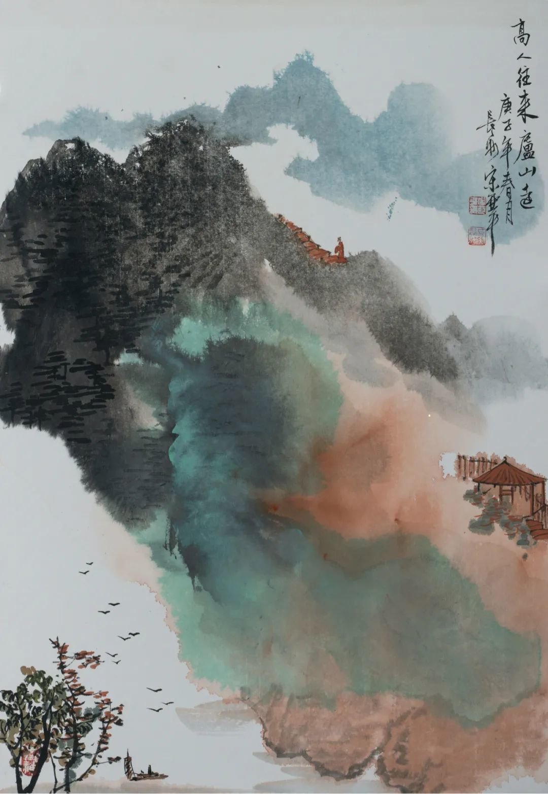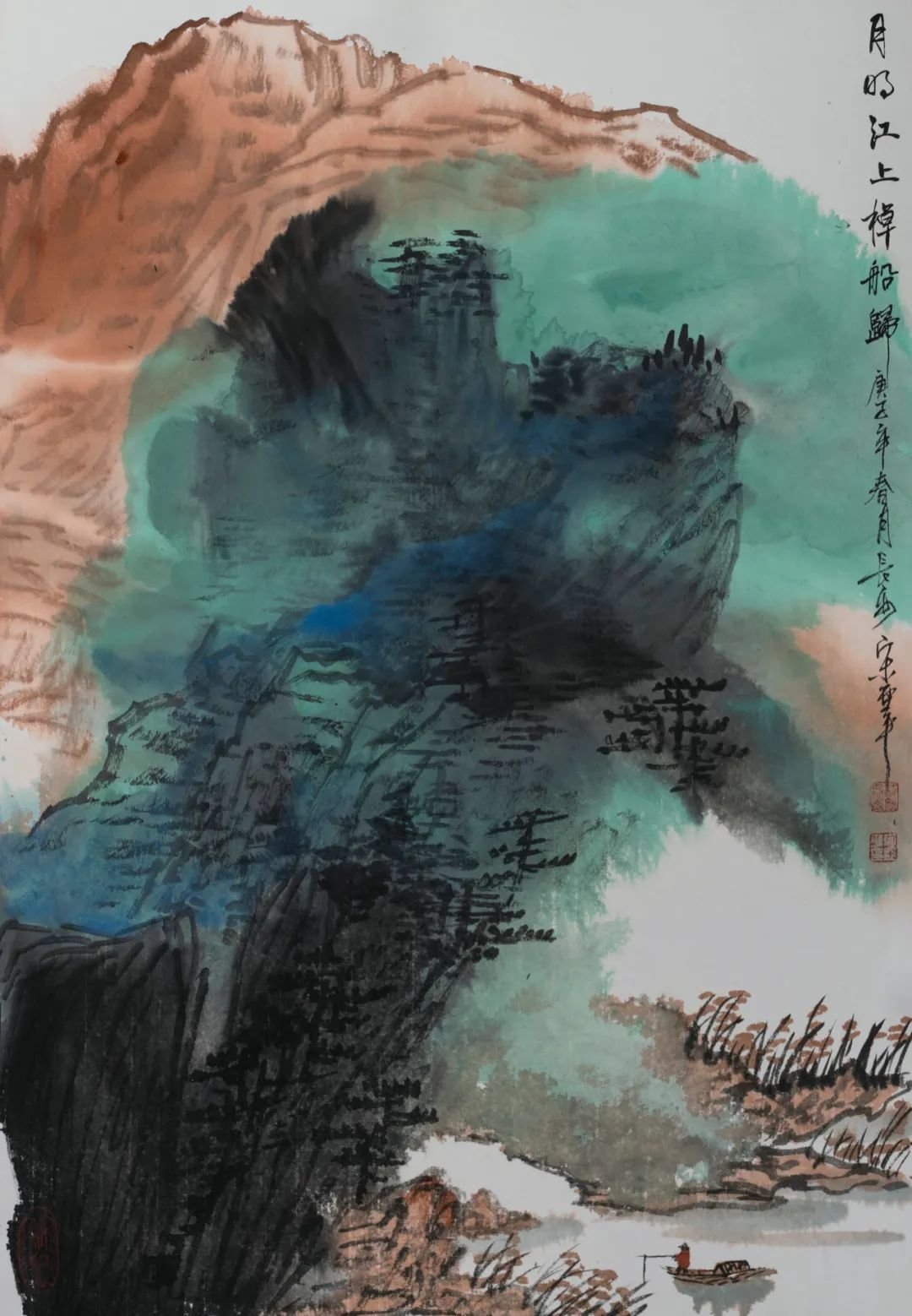 从亞平的青绿山水中,我们能鲜明地感觉到女性画家构思布设上的细腻和精微,色彩感觉上的敏锐和奢华。前者如《春峰迭翠》《萦空迭景》,画家选取了一种高难度的画法,迎难强攻。她敢于去掉植被对山体的复盖,以工笔线描对裸露峥嵘的山体作细腻精微的勾写,不但传达出了石山的质感,表现出了山的气势和脉象,而且使精微变化的线描本身,也构成了有意味的形式,而具有了审美意义。应该说很是难能而可贵了。后者如《山色空蒙翠玉欲流》《峡江垂钓图》,画家大幅度地抛弃了写实性用色,引起了我们的关注。色彩在她那里由表现客体(山川自然)的手段,转化为主体(画家心灵)和本体(色彩自身)的符码言说。她追求的是在超现实的色彩组合中,产生别一种审美意味。不过用色可鲜而不可淫,追求色彩趣味要注意把握度。