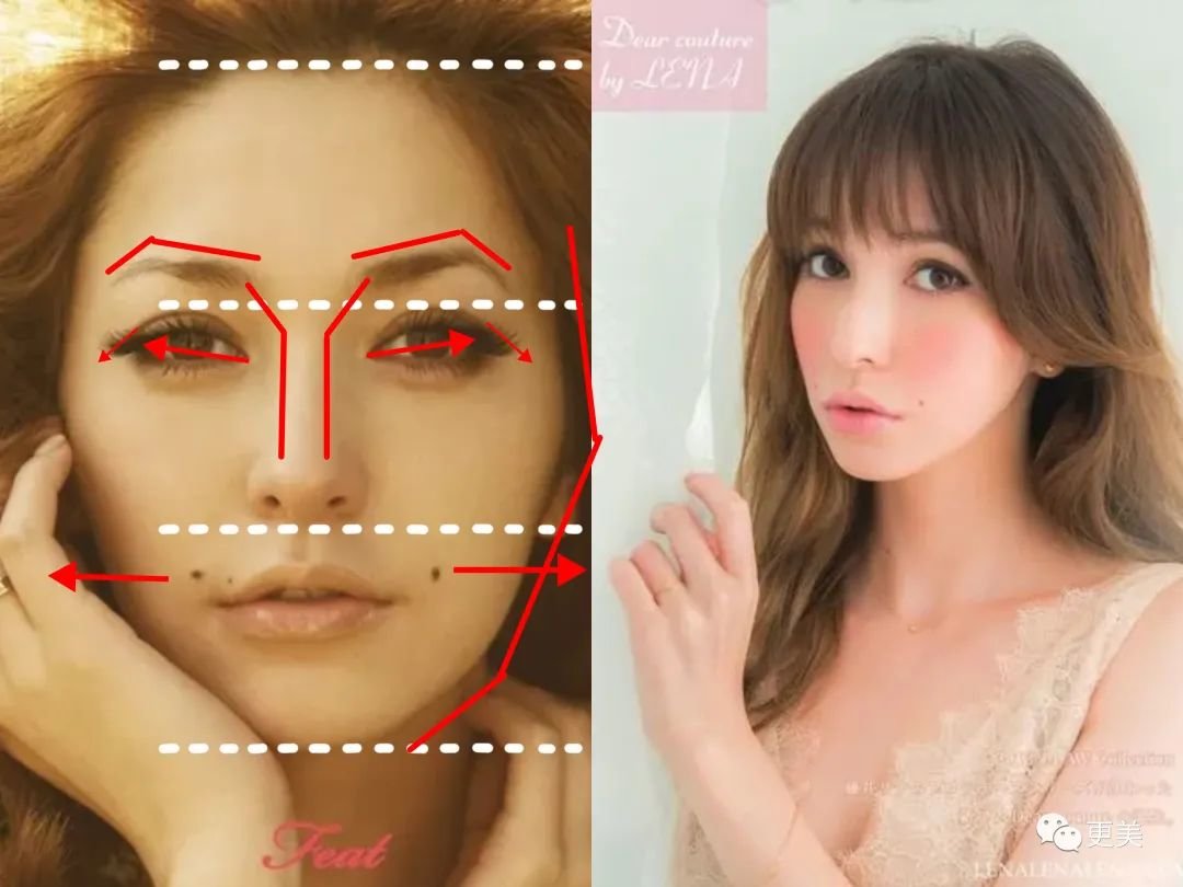 她面型较长、三庭均衡,为了中和其中的成熟感,她使用眼部弧度拉宽面部,唇部饱满,鼻头圆滑,在五官的塑造上,藤井莉娜都在向幼态发力。