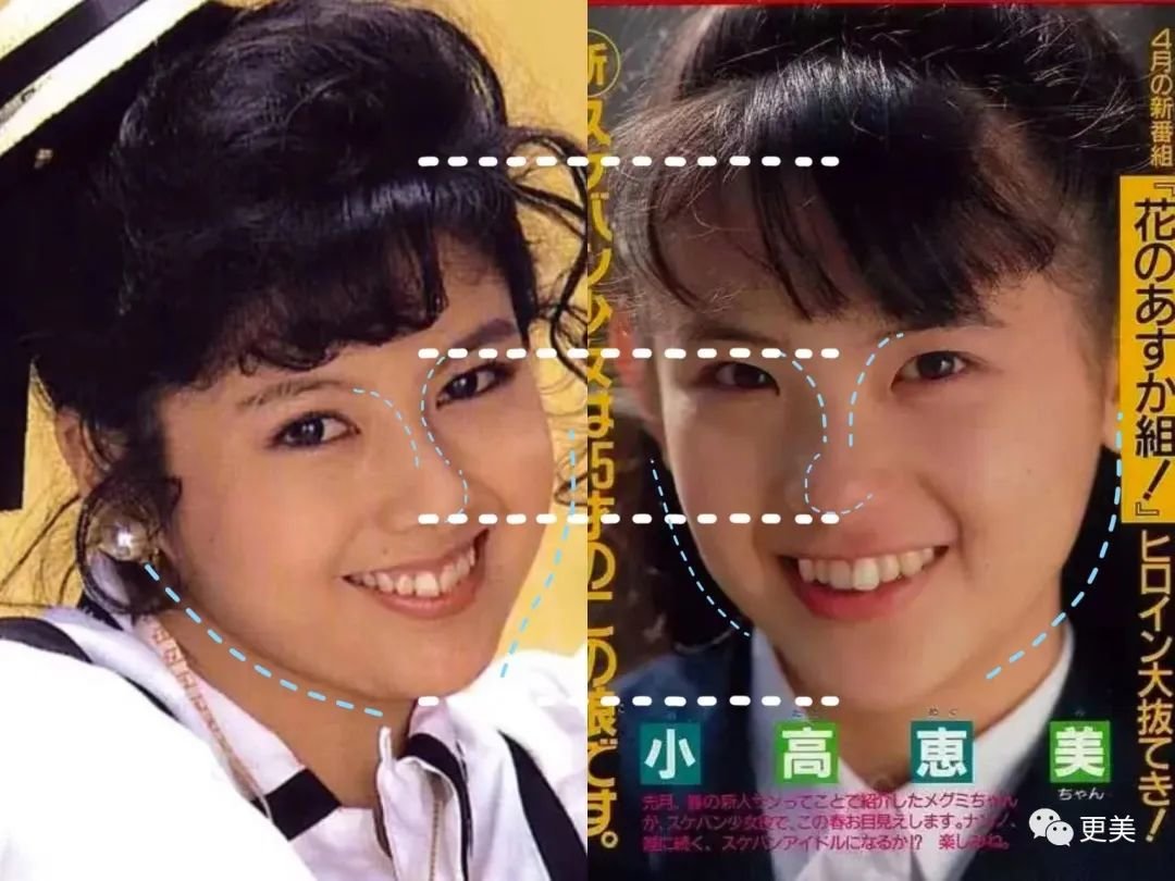 但泽口靖子鼻骨的拐点更高、小高惠美鼻骨的拐点更低,所以小高惠美的混血感减少、清纯甜美感增加。