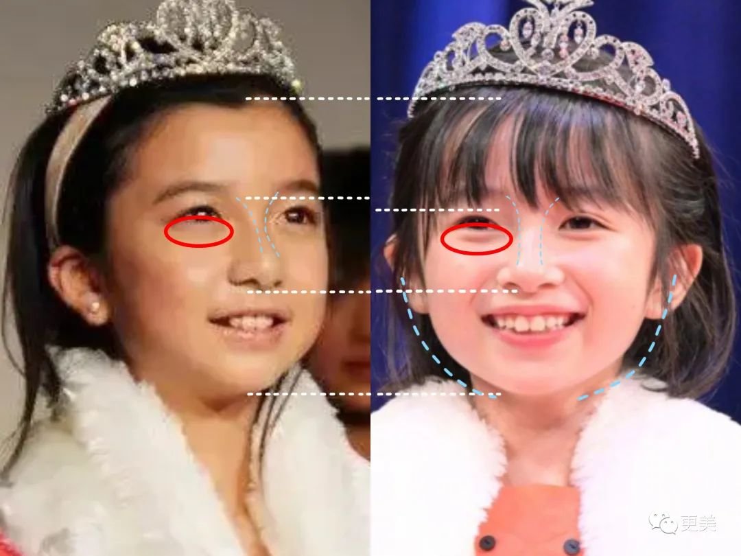 同是10岁的渡边美波,虽然年纪小,但她的脸型明显具有棱角感、而不是肉的类型,眼型、鼻部也更加纤长,其实她的颜值要比上白石萌音精致。