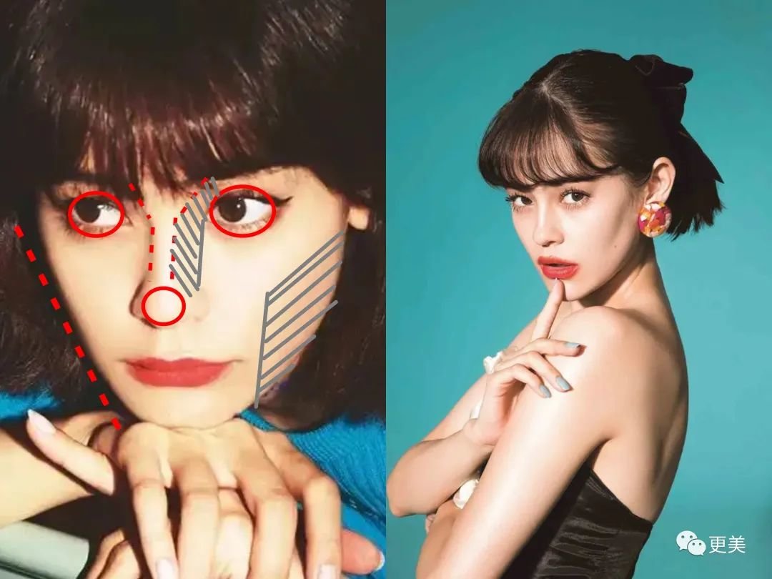对于这种面部不平衡,她首先使用刘海遮住额头,以此平均面部力量,眼妆强调圆、钝,唇部也刻意制造丰满感,加强圆润的幼态感。