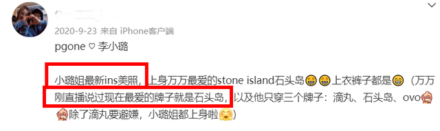还有李小璐一发完照片,PGone就在直播强调自己只穿某几个品牌的衣服,其中一个是最爱的牌子,这个牌子正好就是李小璐穿着的那一身——最爱哦!