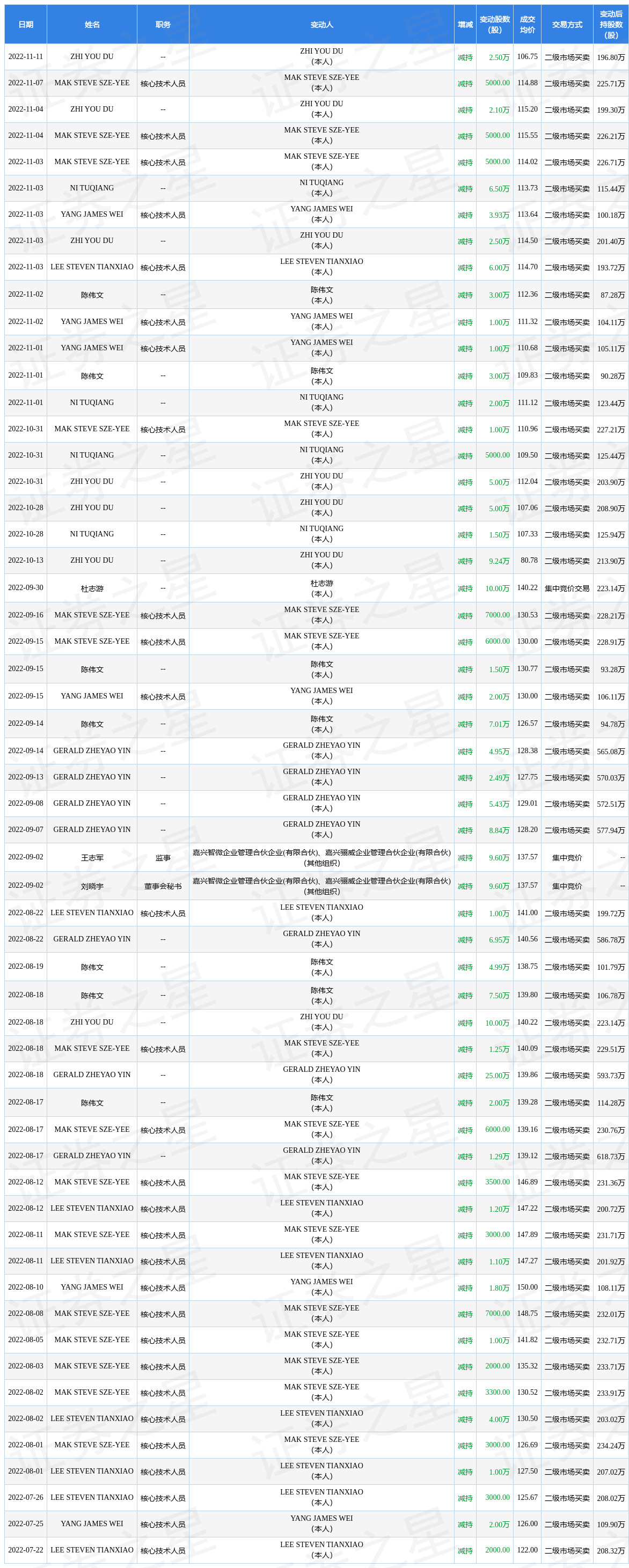 中微公司近半年内的董监高及核心技术人员增减持详情如下: