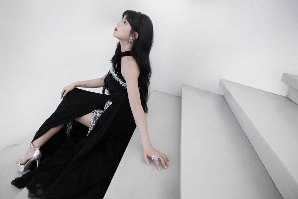 2022年11月12日,陈妍希金鸡奖黑色轻纱银河裙写真。
