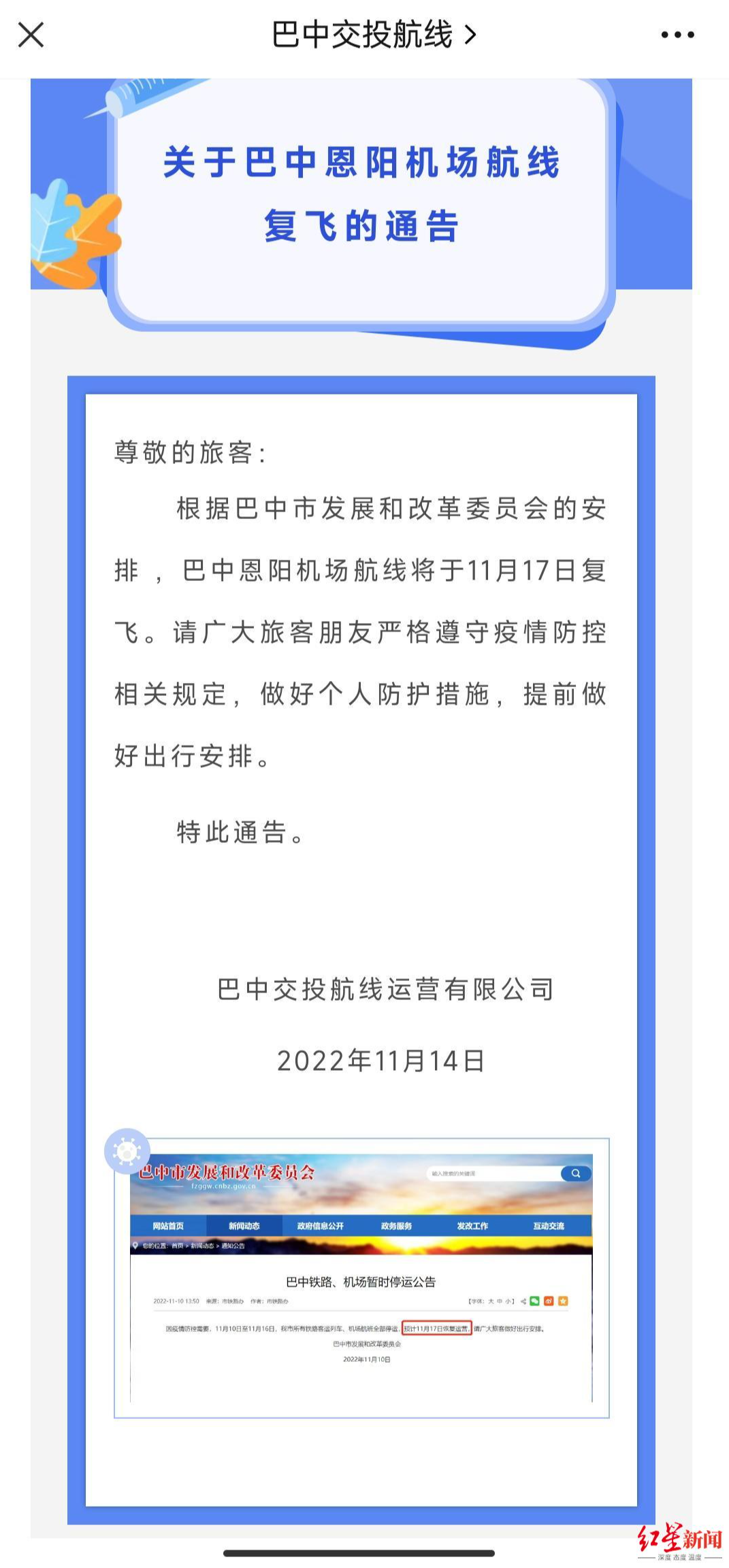 11月14日,巴中交投航线运营有限公司发布通告,根据巴中市发展和改革委员会的安排,巴中恩阳机场航线将于11月17日复飞。请广大旅客朋友严格遵守疫情防控相关规定,做好个人防护措施,提前做好出行出行安排。