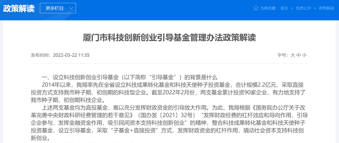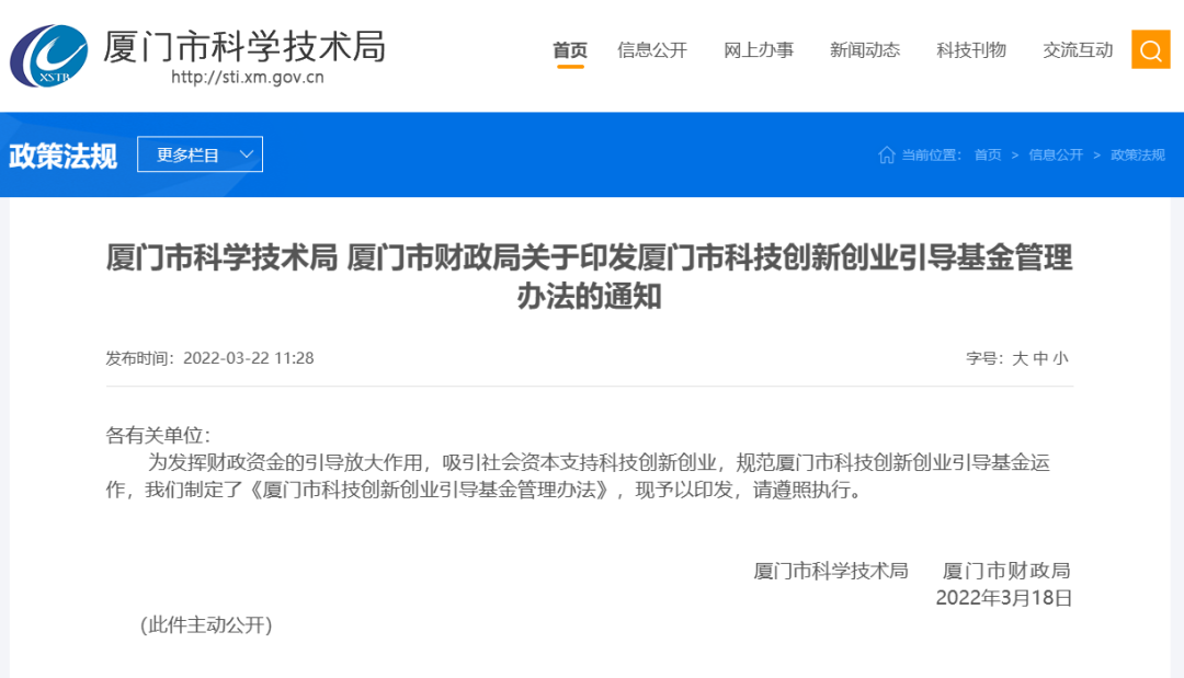 11月4日,厦门市科学技术局发布公告,公示了厦门市科技创新创业引导基金(简称“厦门科创引导基金”)2022年第一批次拟参股子基金名单,公示时间截至11月10日。