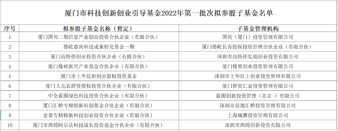 本次厦门科创引导基金共出资10支子基金,分别为: