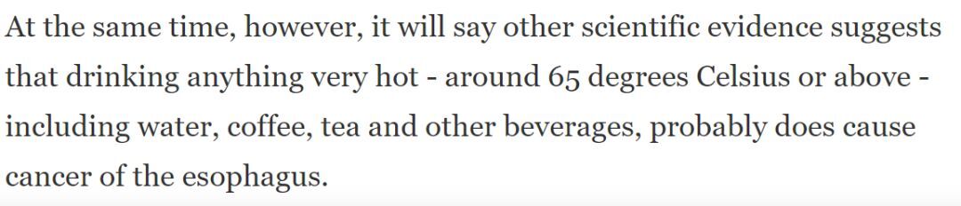 世界卫生组织下属的国际癌症研究机构IARC也指出65度及以上的热饮会增加人体患食道癌的概率,欧盟也将高于65度以上的热饮列入了2A级致癌物,所以一般来说接近于体温37度的温水最适宜应引用。
