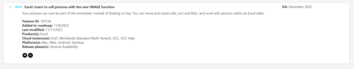 IT之家了解到,在 Microsoft 365 路线图网站新增了功能编号为 101534 的条目,标题为“Excel:新 IMAGE 图像功能新增单元格图片插入功能”,描述中写道:“单元格中插入的图片不再浮动在表面,而是成为工作表的一部分。你可以移动和调整单元格的大小,进行排序和过滤,并在 Excel 表格中处理图片”。
