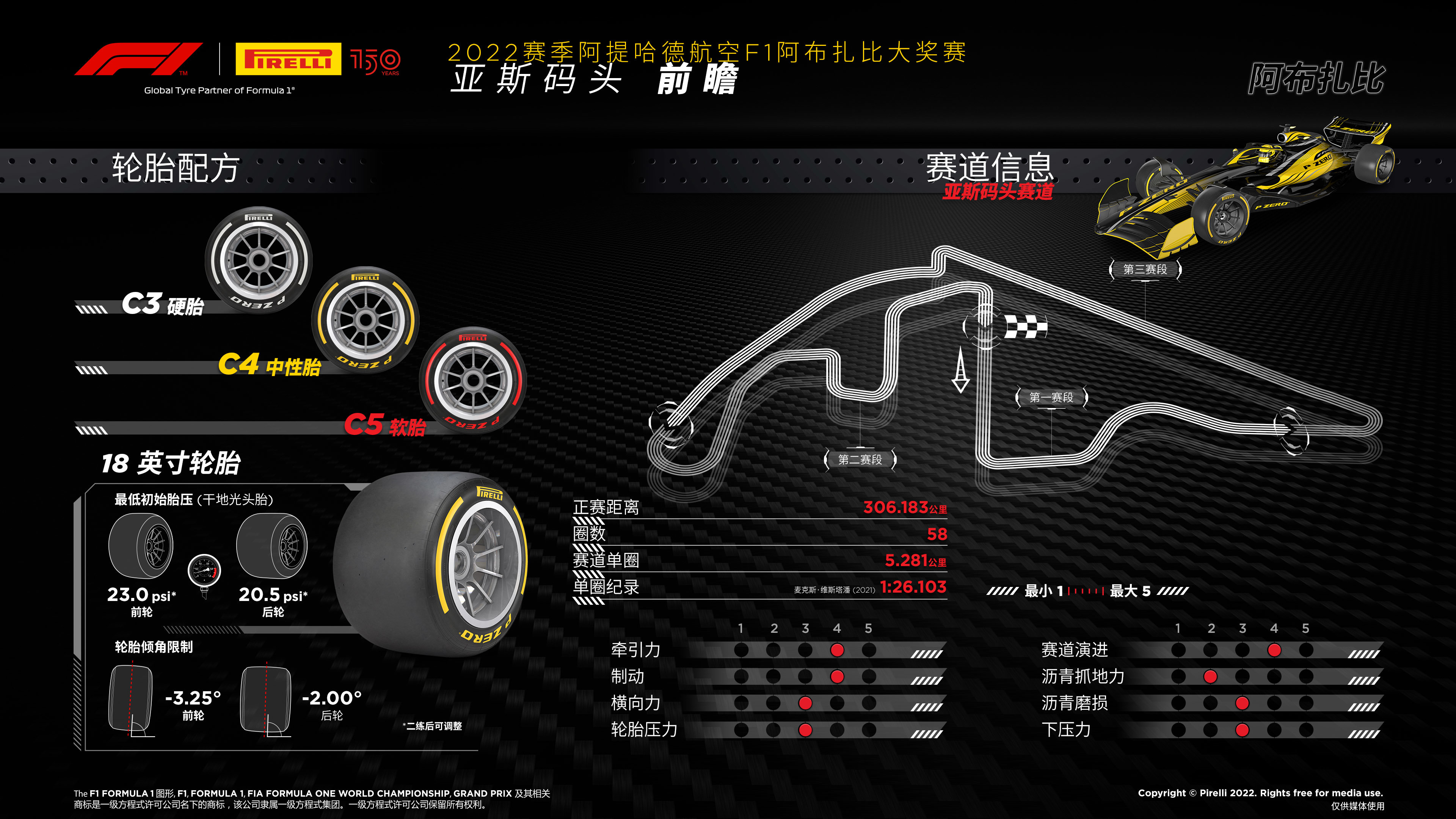 ● 倍耐力将为阿布扎比大奖赛带来轮胎系列最软配方的三款轮胎:C3作为P Zero白色硬胎,C4是P Zero黄色中性胎,C5则是P Zero红色软胎。