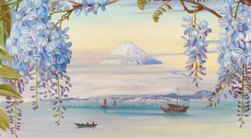 她还会把植物所在之处的景观和相关的风土人情描绘出来,包括寺庙、人群等等,植物往往在前景,加上印象派最善用的光与影,画面因此变得栩栩如生。她的构图独特,比如在描绘富士山的时候,她用悬挂的紫藤作为前景,远处的背景好似舞台幕布,这样的构图方式仿佛拥有了戏剧效果,能让人亲临其境感受现场发生的一切,朦胧的远景还展现出中国古代水墨画般的意境。