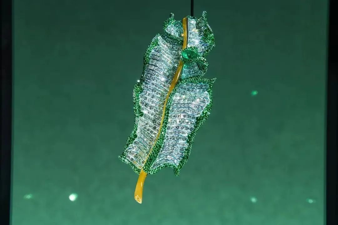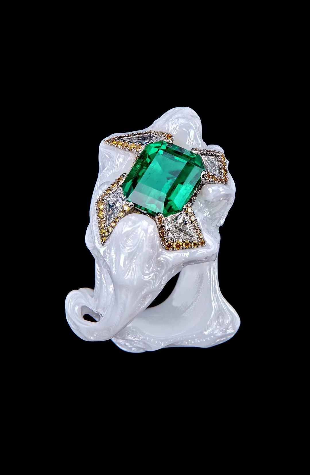 ▲ 陈世英Wallace Chan,浮云有意(Soaring Clouds),祖母绿、钻石、黄钻、世英陶瓷、钛金属 ,3.85 x 3.23 x 2.56 cm,2022年 ©️ART021