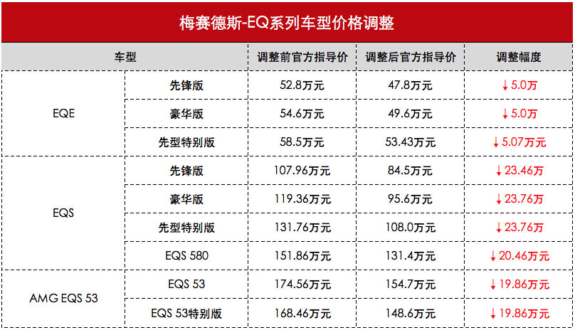 据《汽车行业关注》统计,全新纯电EQE车型调整后的厂商建议零售价为47.8万-53.43万元,相比于原先的52.8万元-58.5万元下调了5.0万-5.07万元;纯电EQS调整后的厂商建议零售价为84.5万-131.4万元,相比于原先的151.86万-107.96万元下调了20.46万-23.46万元;全新AMG EQS 53调整后的厂商建议零售价为148.6万-154.7万元,相比于原先的168.46万-174.56万元下调了19.86万元。